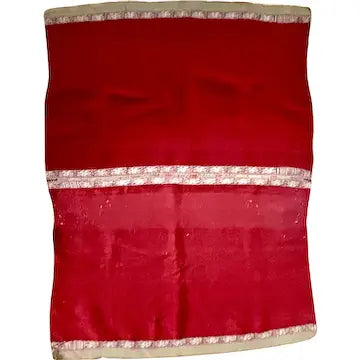 This vintage hand-woven Bolivian aguayo textile features intricate red and gold geometric details, crafted with a very fine weave. Made from wool, it is traditionally used to carry children on the back or small items. A beautiful and practical addition to any wardrobe, perfect for those looking for unique and indigenous pieces.