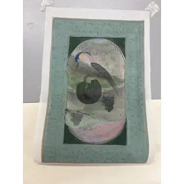 Handcrafted with intricate gold work details, this original vintage Indian miniature painting on silk depicts two graceful peacocks in a peaceful hilly landscape. Its delicate floral border adds a touch of traditional elegance. Perfect for art lovers and collectors seeking a unique and exclusive piece. Unframed.