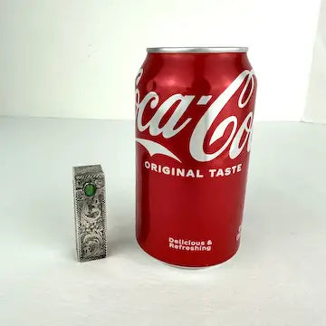 This early 20th century vintage Italian 800 silver lipstick case with mirror showcases exquisite Italian craftsmanship. Made with 800 silver, it features a stunning green glass bead bezel set and a delicate leaf and floral design. Carry your lipstick in style while ensuring a flawless application with the built-in mirror.