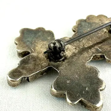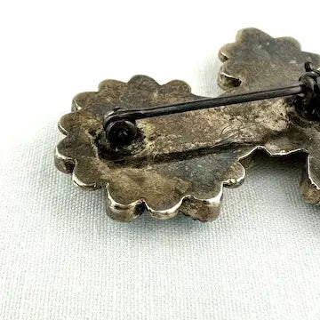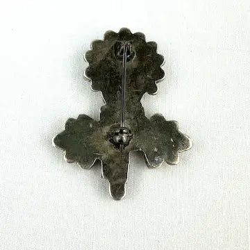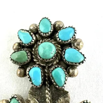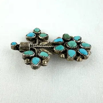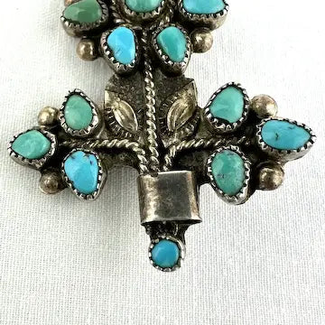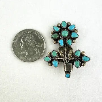Indulge in this luxurious vintage Native American Zuni brooch, crafted with sterling silver and adorned with a stunning turquoise flower in a pot design. Embrace the beauty and craftsmanship of a bygone era with this exquisite accessory. Own a piece of history with this exclusive brooch.