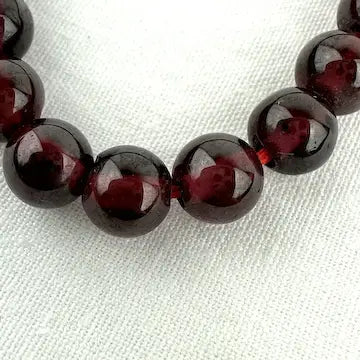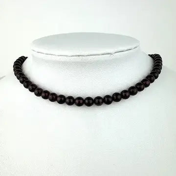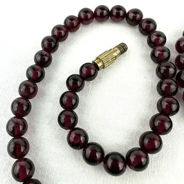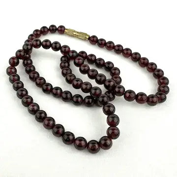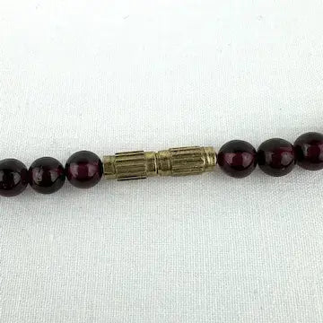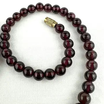 This vintage rhodolite garnet beaded necklace is a choker style, with round beads and a gold tone barrel clasp. Its classic design adds a touch of elegance to any outfit, making it perfect for both everyday wear and special occasions. Don't miss out on this timeless piece of jewelry.