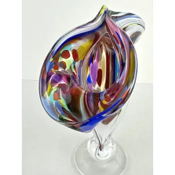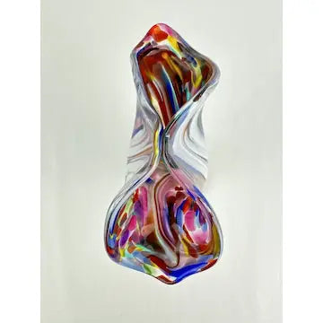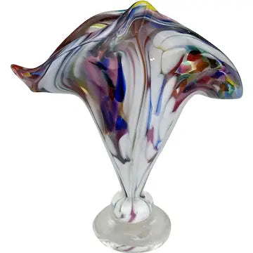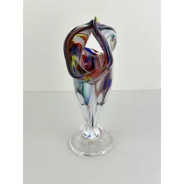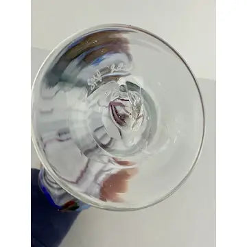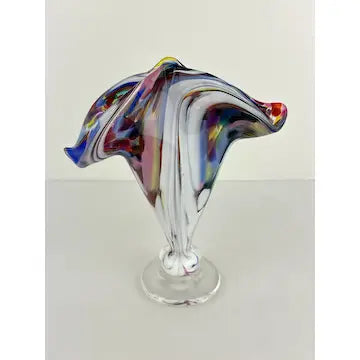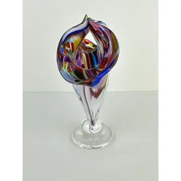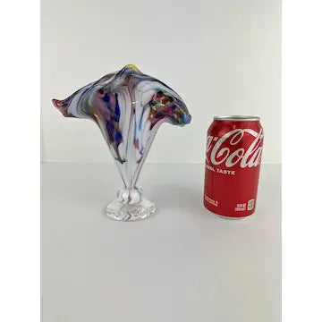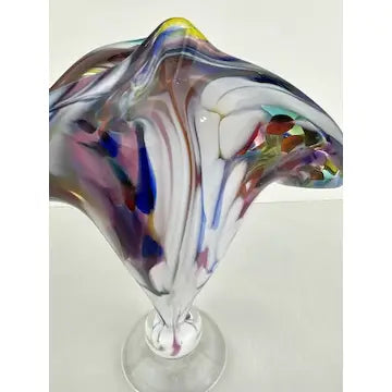Expertly crafted by renowned artist Sy Dowling, this vintage studio art glass vase features a unique crimped design shaped like a flower. Each vase is signed and dated, making it a true collector's item. Add a touch of elegance and sophistication to your home decor with this one-of-a-kind piece.